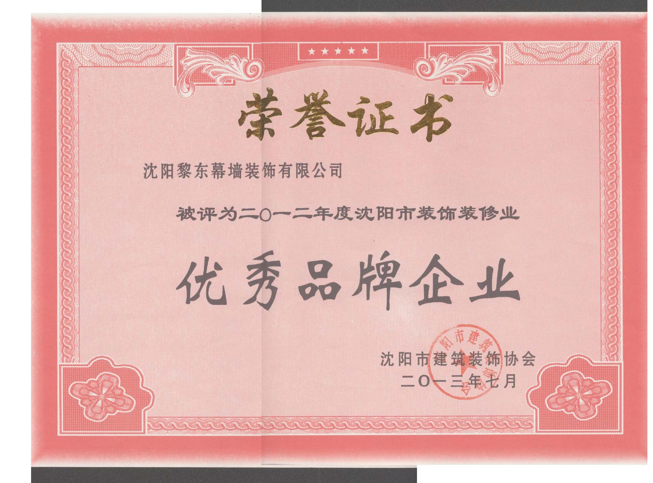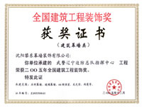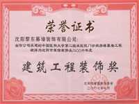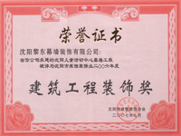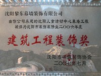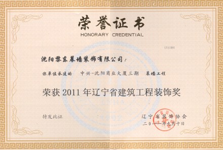 | 2011年遼寧電臺業(yè)務(wù)用房幕墻工程榮獲遼寧省建筑工程裝飾獎 | 2011年中興——沈陽商業(yè)大廈三期榮獲遼寧省建筑工程裝飾獎 | 2011年被評為沈陽市裝飾裝修業(yè)優(yōu)秀品牌企業(yè) |