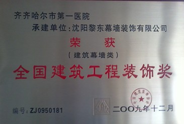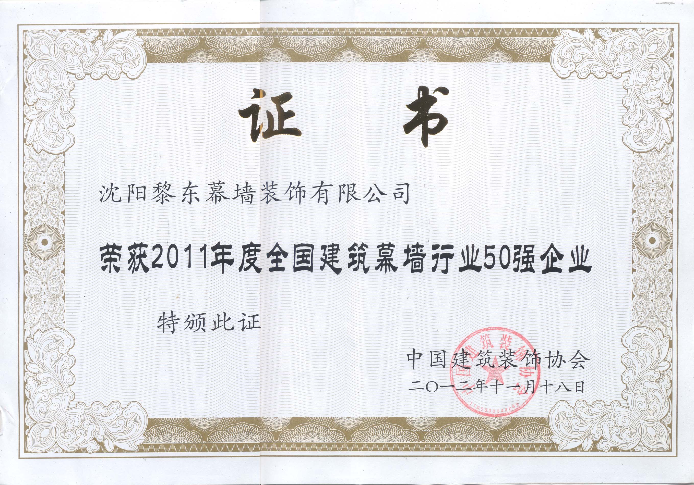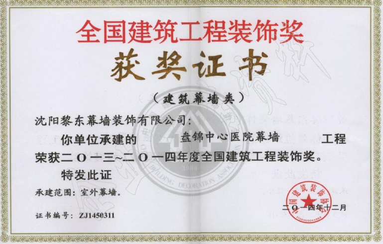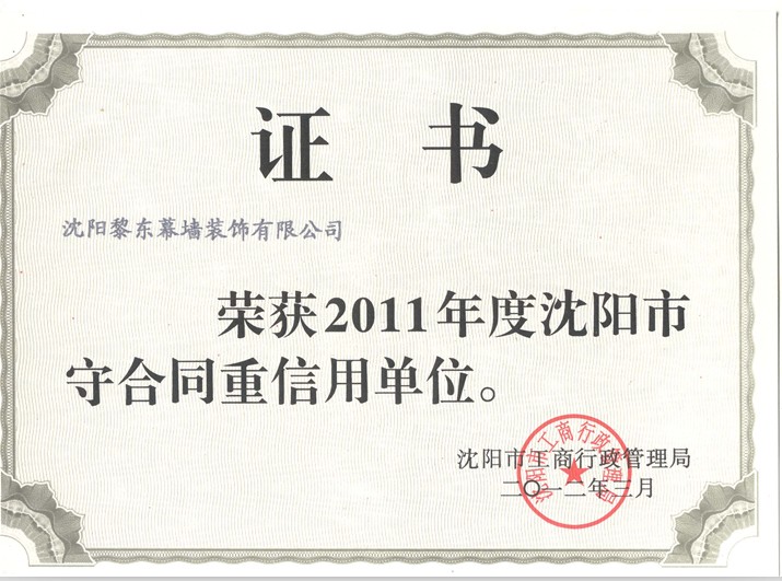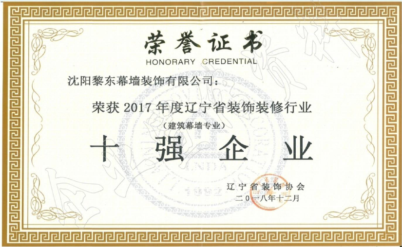 | 2010年榮獲遼寧省裝飾裝修行業(yè)優(yōu)秀企業(yè)家 | 2012年榮獲全國建筑幕墻行業(yè)50強企業(yè) | 2012年榮獲沈陽市守合同重信用單位 |