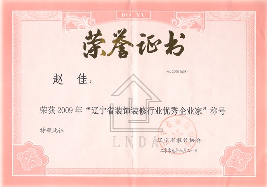 | 2009年獲無錫保利廣場大酒店全國建筑工程裝飾獎 | 2009年趙佳獲遼寧省裝飾裝修行業(yè)優(yōu)秀企業(yè)家 | 2009年度遼寧省裝修裝飾行業(yè)十強企業(yè) |