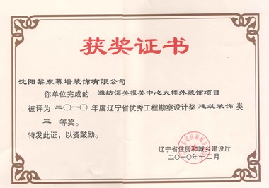 | 2011年獲大連萬和購物廣場遼寧省建筑工程裝飾獎 | 2010年獲濰坊海關(guān)報關(guān)中心大樓外裝飾優(yōu)秀勘察設(shè)計獎 | 2010年獲濰坊海關(guān)報關(guān)中心全國建筑工程裝飾獎 |
