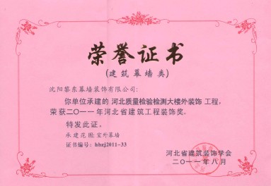 | 2010年獲守合同重信用單位 | 2010年榮獲遼寧省裝飾裝修行業(yè)建筑幕墻專業(yè)十強企業(yè) | 2011年河北質(zhì)量檢驗檢測大樓外裝飾工程榮獲河北省建筑工程裝飾獎 |