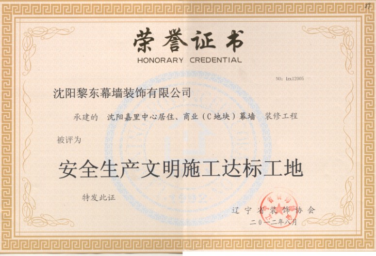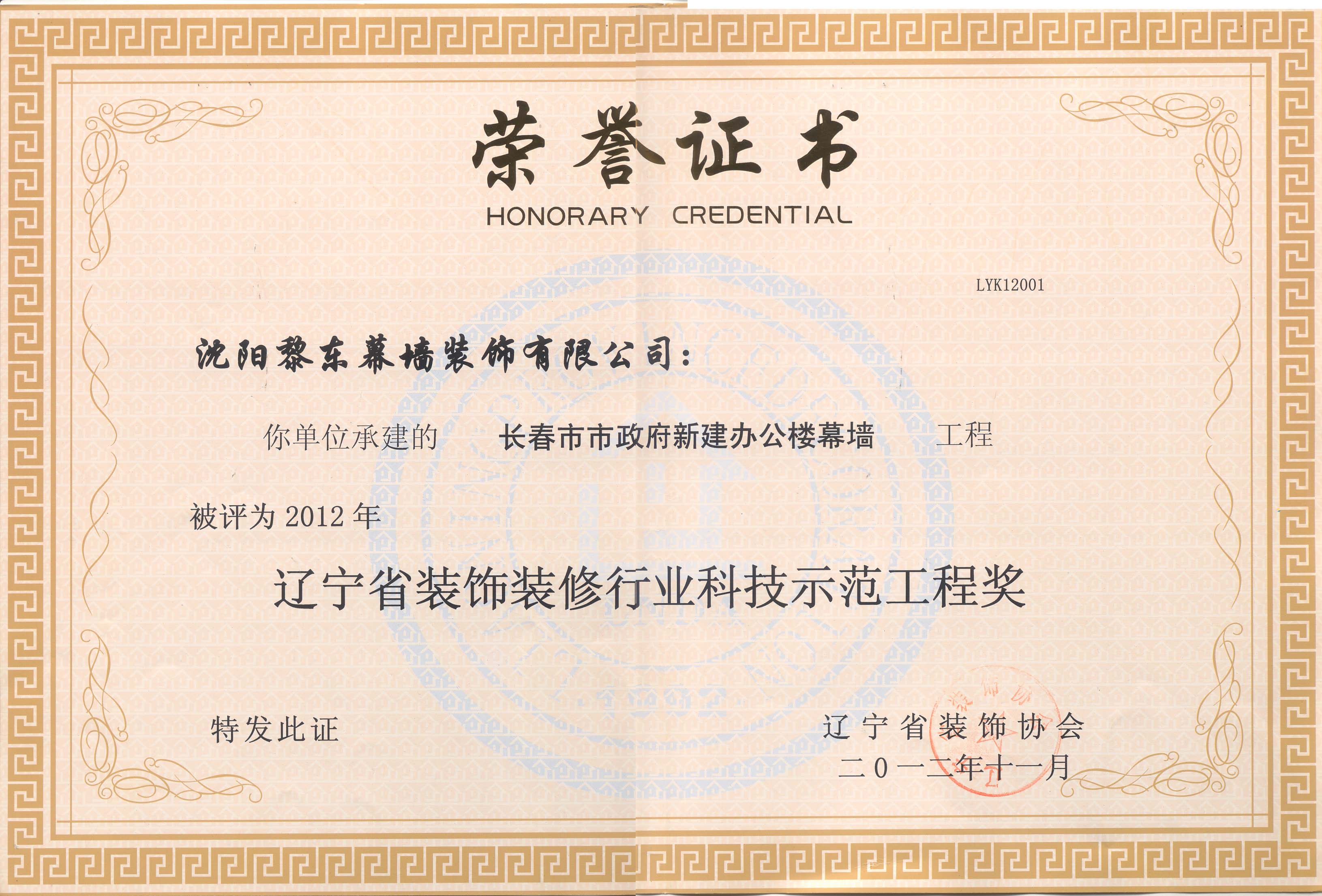 | 2011年榮獲沈陽市守合同重信用單位 | 2012年嘉里中心榮獲安全生產(chǎn)文明施工達標單位 | 2012年長春市市政府新建辦公樓榮獲遼寧省裝飾裝修行業(yè)科技創(chuàng)新成果獎 |