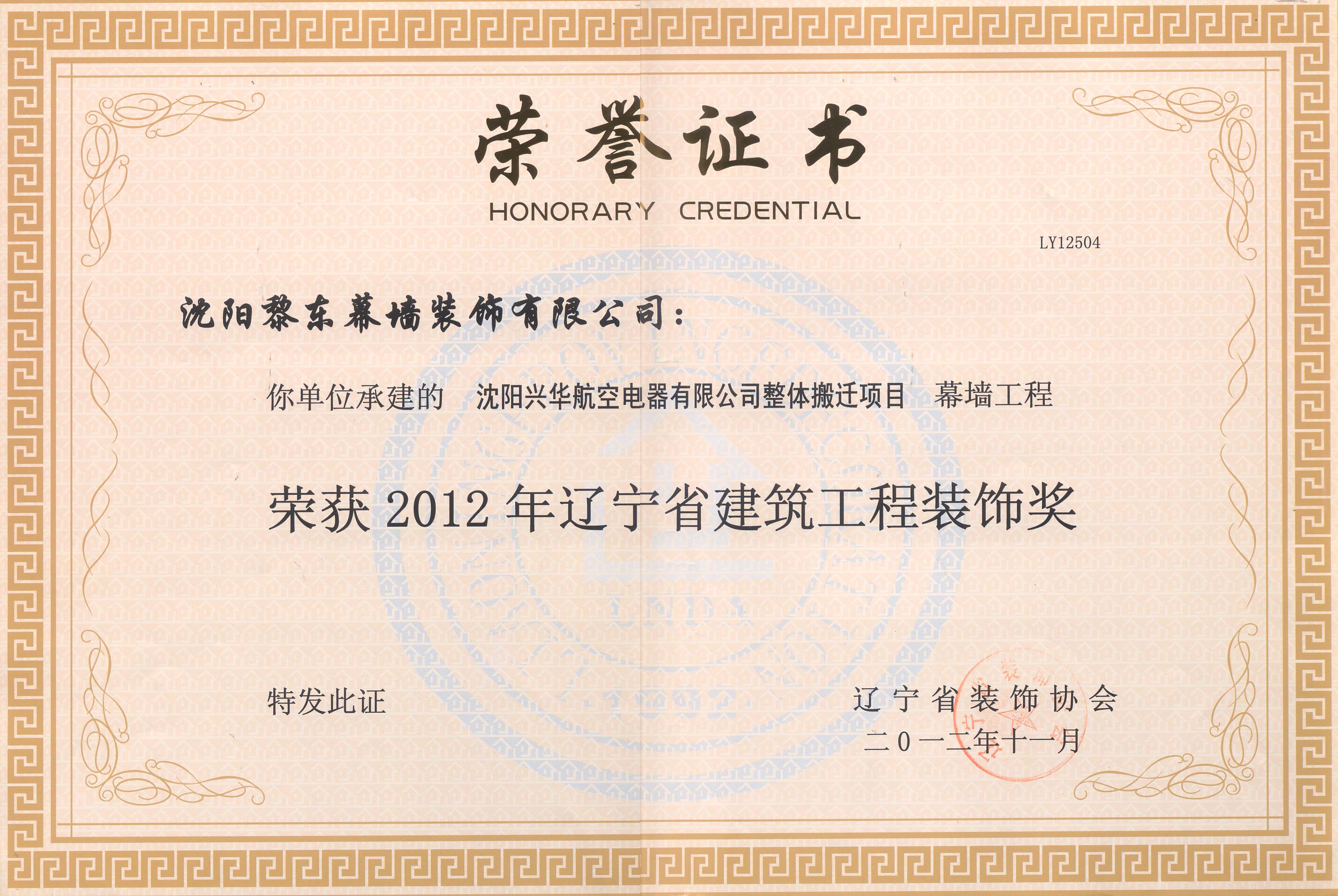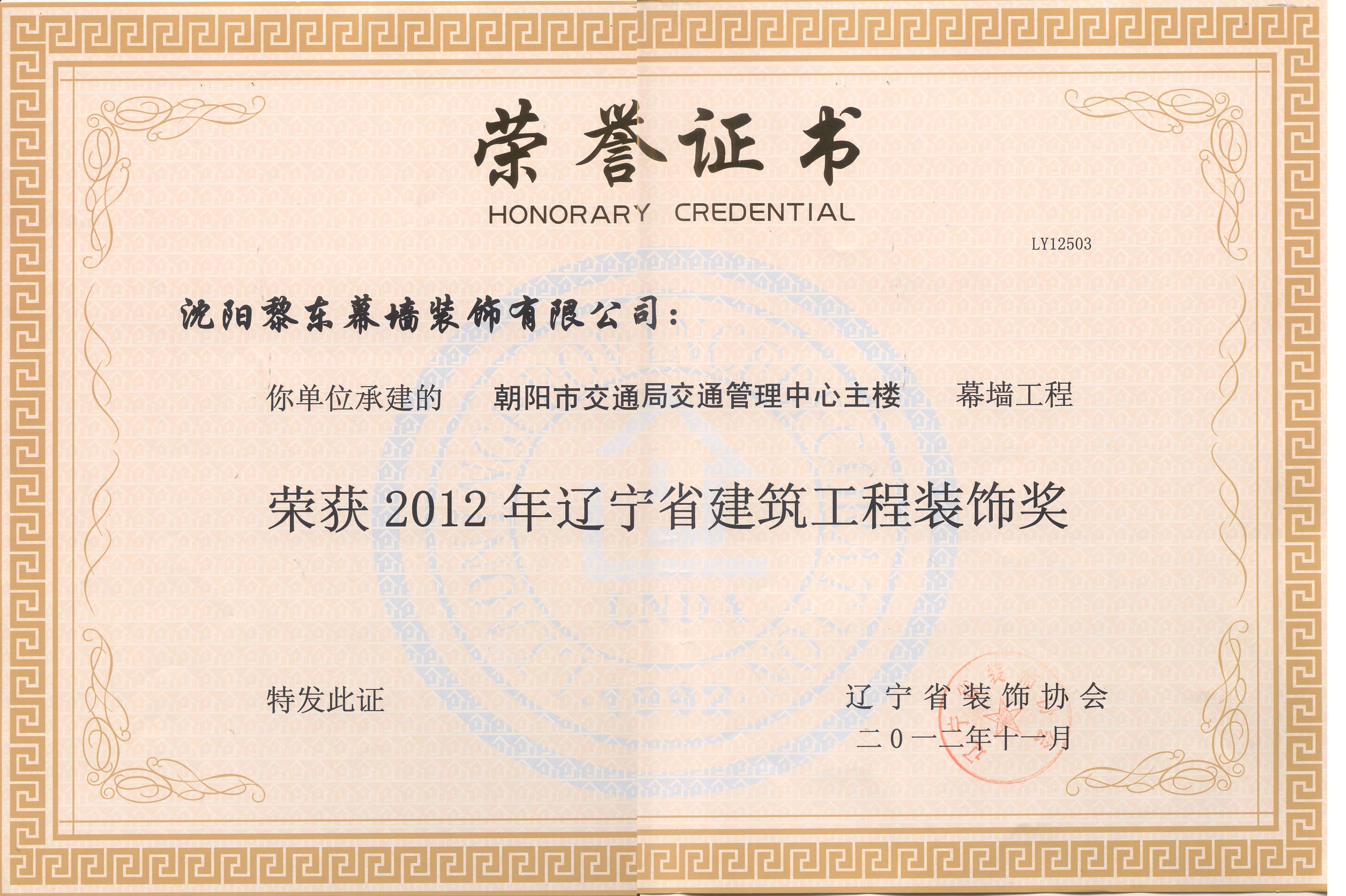 | 2012年長春市政府新建辦公樓榮獲遼寧省裝飾裝修行業(yè)科技示范工程獎 | 2012年朝陽市交通局交通管理中心主樓榮獲遼寧省建筑工程裝飾獎 | 2012年沈陽興華電器有限公司整體搬遷項目榮獲遼寧省建筑工程裝飾獎 |