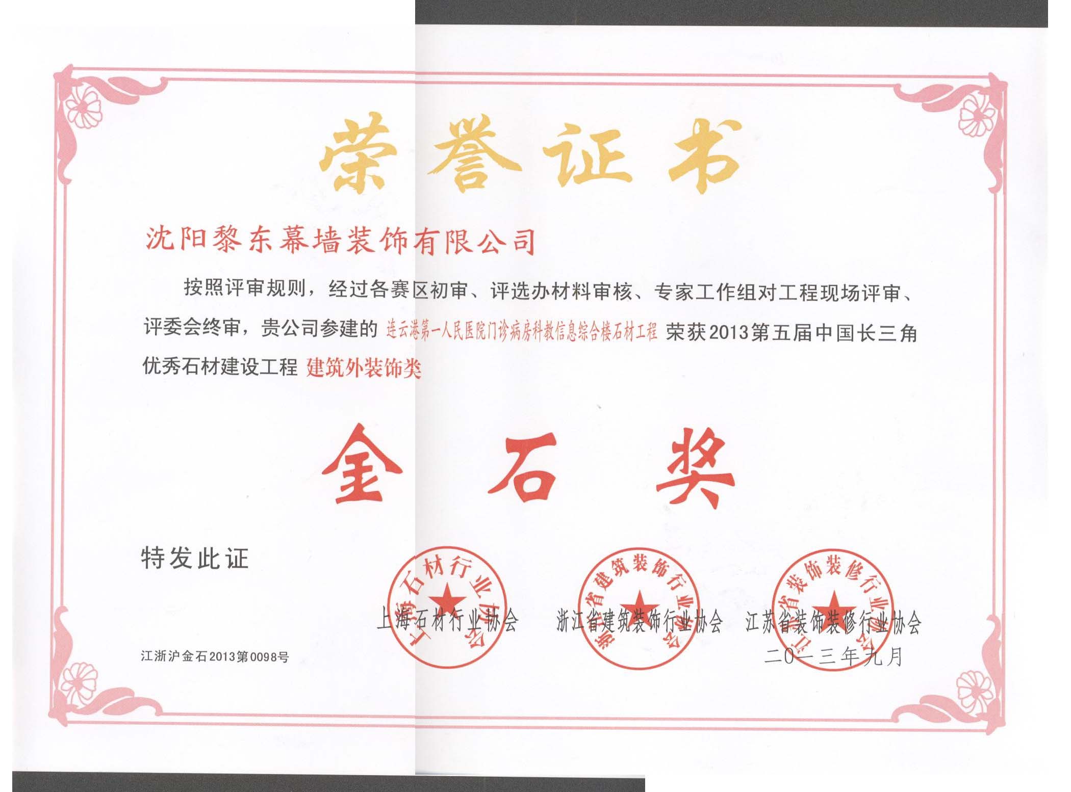 | 2012年榮獲沈陽市裝飾裝修業(yè)優(yōu)秀品牌企業(yè) | 2013年連云港第一人民醫(yī)院門診病房科教信息綜合樓石材工程榮獲建筑外裝飾類金石獎 | 2013年沈陽五愛保成希爾頓逸林酒店榮獲遼寧省建筑工程裝飾獎 |