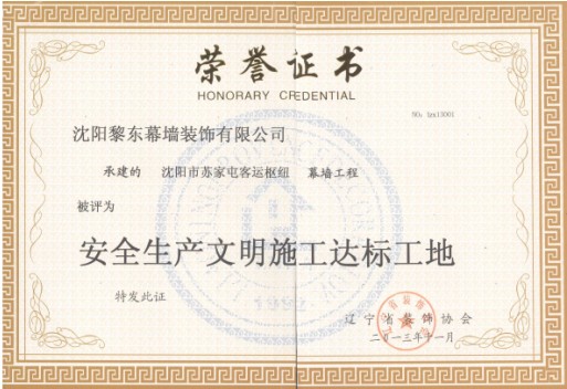 | 2013年沈陽市蘇家屯客運樞紐工程被評為安全生產(chǎn)文明施工達標工地 | 2013年榮獲遼寧省裝飾裝修行業(yè)優(yōu)秀項目經(jīng)理 | 2012年榮獲全國建筑幕墻行業(yè)50強企業(yè) |