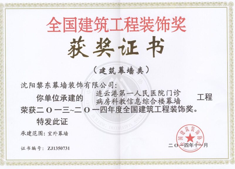 | 2014年獲中國建筑裝飾三十年優(yōu)秀裝飾施工企業(yè) | 2014年獲中國建筑幕墻行業(yè)百強 | 2013-2014年獲連云港第一人民醫(yī)院裝飾獎 |